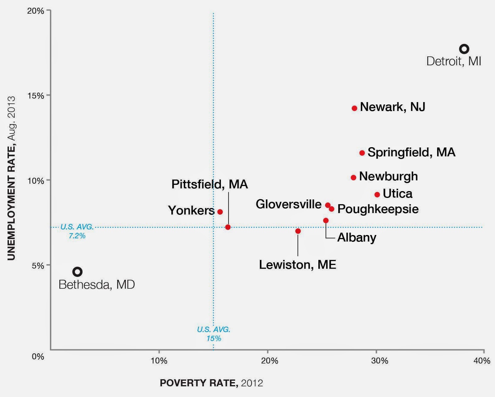 The cities plotted above, and pictured below, are here simply because I happened to pass through them during the last few years. The chart's six cities with no state designation are in New York. I’ve included Bethesda and Detroit as reference points for the extremes on the spectrum of employment and income.